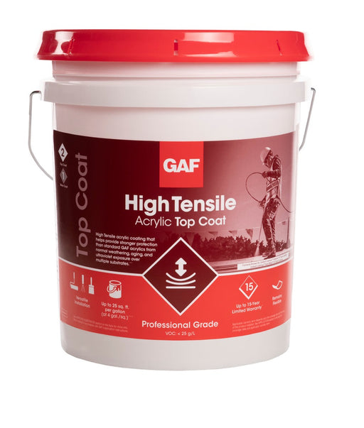 GAF High Tensile Acrylic Topcoat has high tensile emulsion polymers combined with reinforcing pigments for strong physical properties and durabilit...